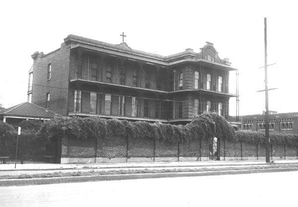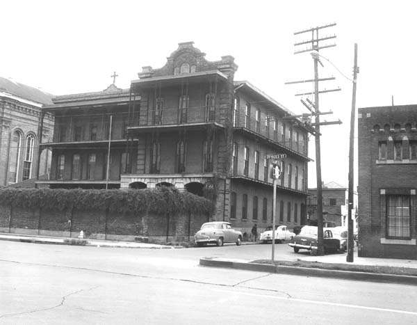 In 1860, Dominican Nuns from Cabra, Ireland came to the city to open an academy for girls. Shortly after their arrival, they began to accept boys who were too young to start their education with the Christian Brothers. Later, when yellow fever forced the Christian Brothers to leave the city, the Sisters, also, agreed to teach boys of "manageable age." This was the beginning of St. John the Baptist School. It remained open for almost one hundred years. Not long after the photos below were taken in 1956, the school buildings of St. John the Baptist were demolished to make way for the elevated Pontchartrain Expressway. However, the tradition of the school and the Dominican Sisters' work in the city lives on at St. Mary's Dominican High School. In 2000, when ground was broken for a new building for the school, soil was transported from the former site of St. John the Baptist School, from the St. Charles Avenue campus of St. Mary's Dominican, and from Cabra, Ireland, home of the first Dominican Nuns who came to New Orleans, to pay tribute to the school's history. St. John the Baptist Church remains. This church building was dedicated in 1872, designed by architect, Albert Diettel and built by Irish contractor, Thomas Mulligan. I received a note from Fred Bullinger saying that, when fund-raising for the church's construction was underway, his g-grandparents donated their jewelry to the building fund. He, also, wrote that Fr. Screen had the steeple gold-plated with funds from the sale of the school. -- Nancy |