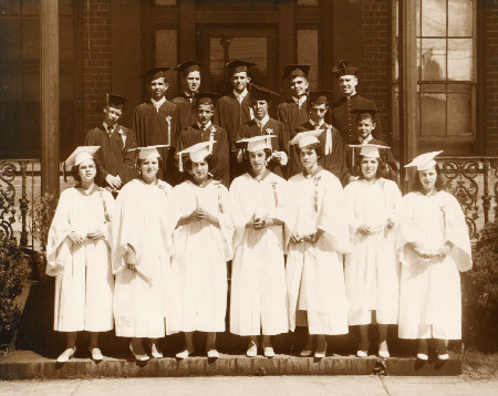 With much appreciation to Ed Lacheney for sharing the photos above and below. The picture above is of the 1954 graduating class (the next to last graduating class). Some of those pictured are, first row, l to r: Mary __, Elaine Thompson, Elizabeth Stroder, Dolores __, Joyce Francella Second row: Ronald Kellie, __ __, Roy Palmer, __ __, __ __ Third row: Ed Lacheney, David Domino, Louie Degree, Sal Fontana, Msg. Arthur T. Screen Below is a photograph of Sister Mary Matthews, OP, 1950, who taught Ed, his uncle and his sister. |