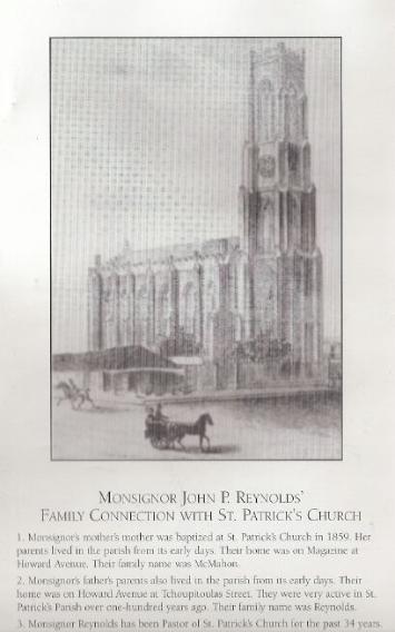 With thanks to Fred Bullinger for sharing the image above; it reads: Monsignor John P. Reynolds' Family Connection with St. Patrick's Church Monsignor's mother's mother was baptized at St. Patrick's Church in 1859. Her parents lived in the parish from its early days. Their home was on Magazine at Howard Avenue. Their family name was McMahon. Monsignor's father's parents also lived in the parish from its early days. Their home was on Howard Avenue at Tchoupitoulas Street. They were very active in St. Patrick's Parish over one hundred years ago. Their family name was Reynolds. Monsignor Reynolds has been pastor of St. Patrick's Church for the past 34 years. |