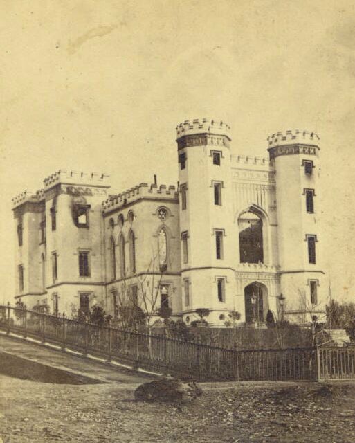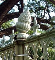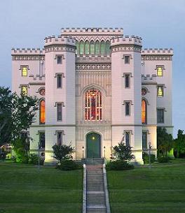 This photograph above of the Old State Capitol in Baton Rouge was taken in 1862, after the interior was destroyed by fire. The fire was started accidentally while the building was being used as a prison and garrison by Union troops. The capitol was designed by James Dakin and construction had been completed in 1852. After the fire, the building stood empty until 1882, when the interior was completely reconstructed by architect and engineer William Freret. The legislature continued to use the building until 1932, when a new capitol was constructed. In 1936, the Works Progress Administration moved into the building and occupied it until the early 1940's. The Old State Capitol stood empty and neglected for decades. But, in 1991, a group of citizens and politicians saved the building from demolition and the overwhelming task of restoring the building started. In 1994, Phase I, the restoration of the interior, was completed; in 2006, Phase II, restoration of the exterior was finished. Phase III, completed in 2008, involved the restoration of the fence which surrounds the 5 acre tract of land on which the old capitol was built. The cast-iron fence was cast and erected in 1855 by the John Hill Foundry. The design is unique, in that the fence is constructed by interlocking parts, the only bolts that are used secure the posts to the base plates. The project required that each section of the fence be sent to an ironworks in Alexander City, Alabama for restoration. |