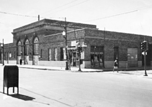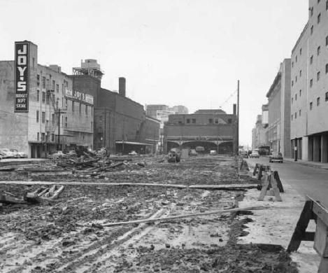 Photo shows the rear of the Southern Terminal during the removal of its tracks, 1950's. |
