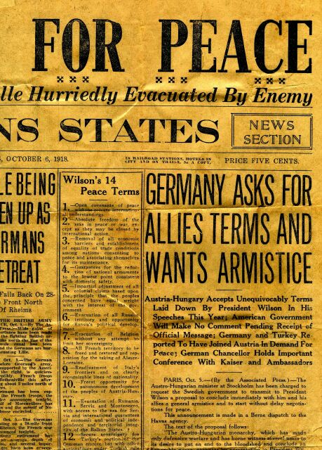 The image below is a segment from the front page of the New Orleans States Item announcing the impending surrender of Germany, October, 1918. Bob Moulin shared this with us, his father had saved it. |