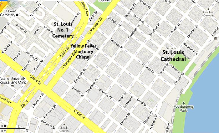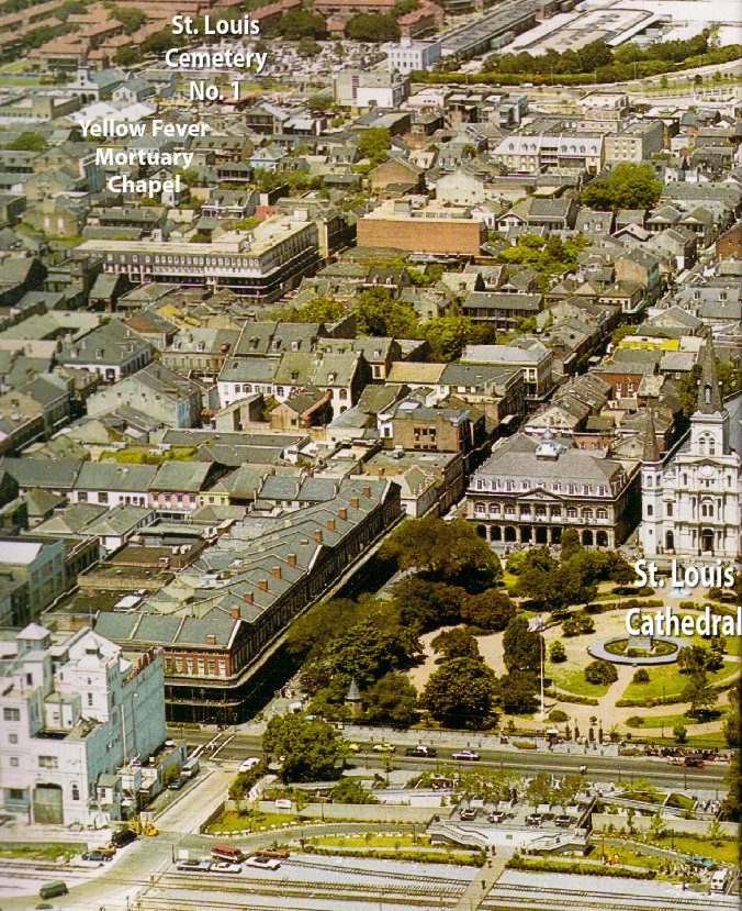 Aerial View and Map of the French Quarter Showing locations of Mortuary Chapel and St. Louis No. 1 Cemetery |