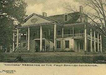 | Above and below, Concord, residence of the first Spanish Governor, Don Manuel Gayoso de Lemos, who built the house in 1794. After he became Governor-General of Louisiana, he sold the house to Stephen Minor, who took over his former post. The Minor family moved after the Civil War and the home fell into a long period of deterioration. It burned in 1901, just as new owners made plans to refurbish it. Click here for an interesting story about Mrs. Stephen Minor and a photo of her gravesite. Photo on right, below, shows only front staircase remaining after the fire. |