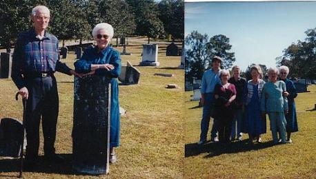 Visiting Union Church Cemetery, Jefferson County, MS Left: Edgar Josiah Garrett and Bessie Murray Garrett, standing by the grave of their g-grandfather, Isaac Garrett Right: Garrett cousins, L. to R.: Jim Brister, Elsie Garrett Anglin, Nancy Jackson Brister, Barbara Murrary Goss, Joyce Garrett Massengale, Bessie Garrett Murray |