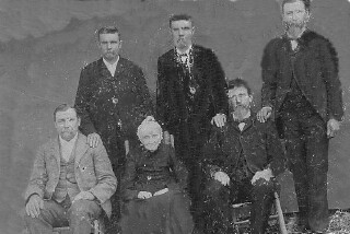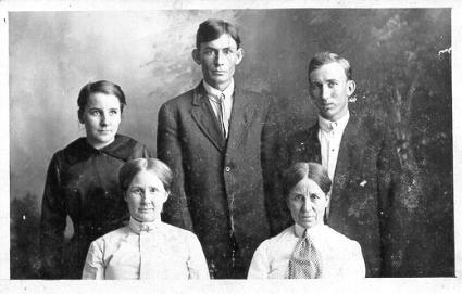 Abba and the Boys, 1895, Jefferson County, MS Standing, left to right: Isaac Newton Garrett; Benjamin Garrett; Jacob Garrett. Seated, left to right: David Garrett, my 2-g-grandmother, Abba Ann Warren Garrett; Josiah Garrett, my g-grandfather |