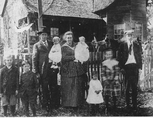 Garrett Family, abt. 1916, Oak Grove Community, Franklin County, MS Left to right: Edgar J. Garrett; Benton Garrett; Edgar Josiah Garrett, holding Bessie Garrett; Ada Mae Dawkins Garrett, holding Jessie Garrett; Ernestine Garrett; Florelle Garrett; Virgil Garrett |